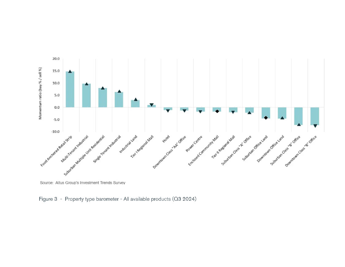 - In Q3, investors’ top three preferred property types continued to be food-anchored retail strip assets, multi-tenant industrial, and suburban multiple-unit residential.