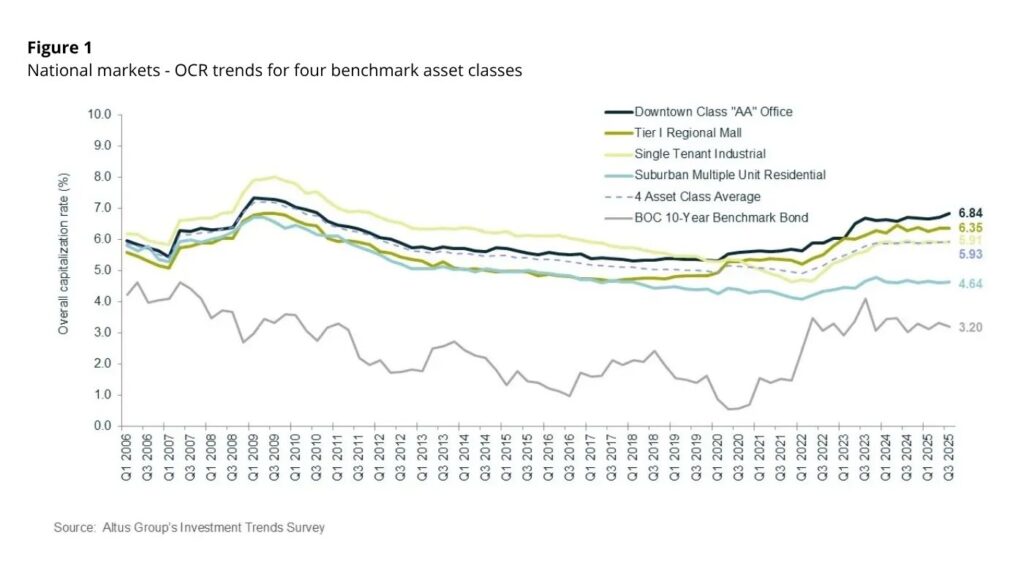 According to Altus Group’s Investment Trend Survey, the Canadian CRE industry in Q3 2025 continued to reflect strong investor interest in stable, lower-risk assets in an uncertain economic environment. The prevailing economic uncertainty, compounded by trade volatility, prompted investors to continue a cautious approach to capital deployment.