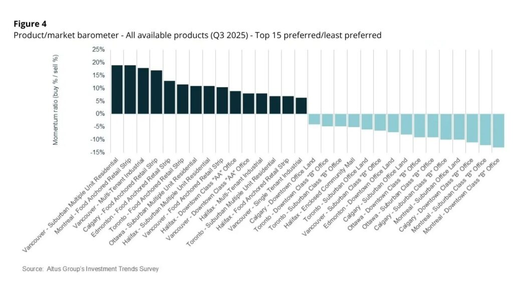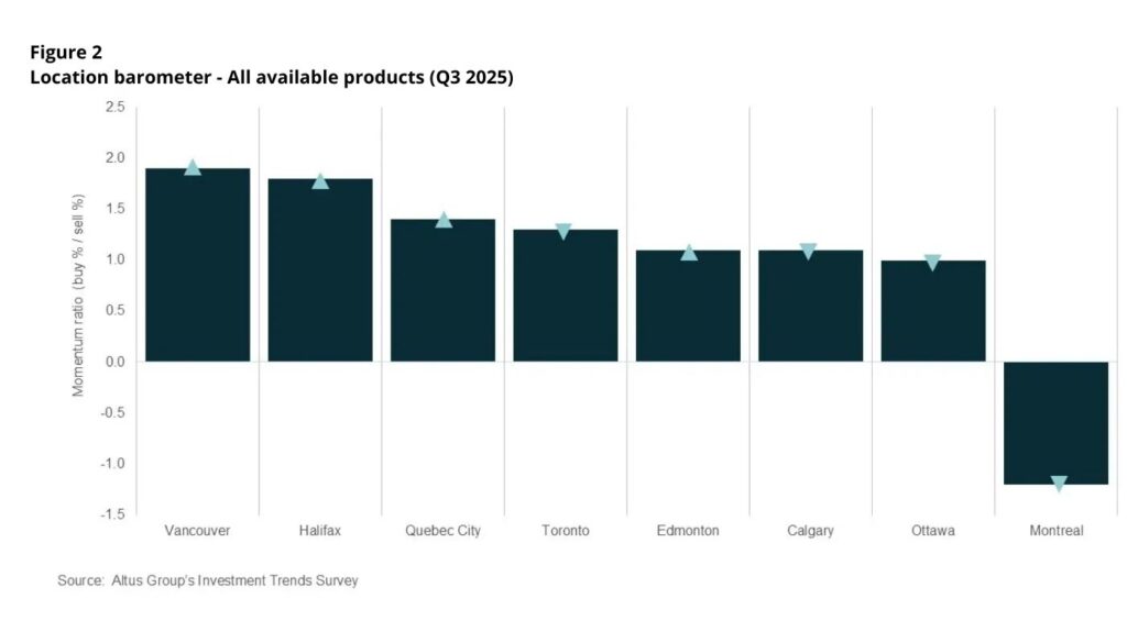 - Vancouver, Halifax, and Quebec City emerged as the leading preferred markets for investors across all primary asset classes in Q3 2025. (Fig.2)