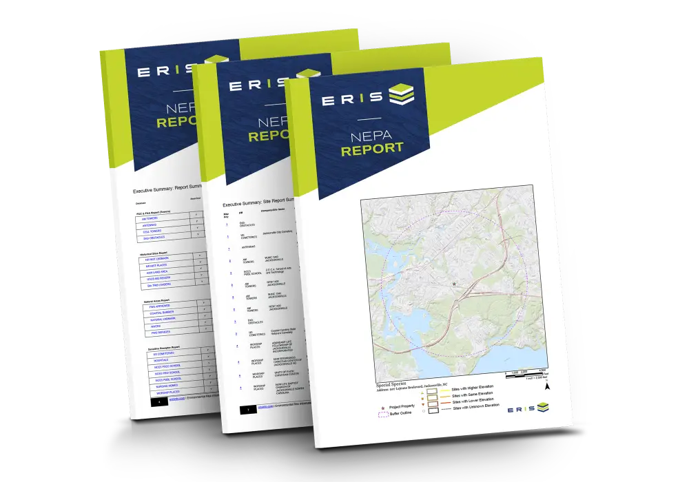 The ERIS NEPA Report is an invaluable first step in your impact analysis. With critical information on wildlife refuges, historical sites, sensitive receptors, and more, our report streamlines your assessment process and helps ensure NEPA compliance. Our report provides fast and easy access to this vital data.