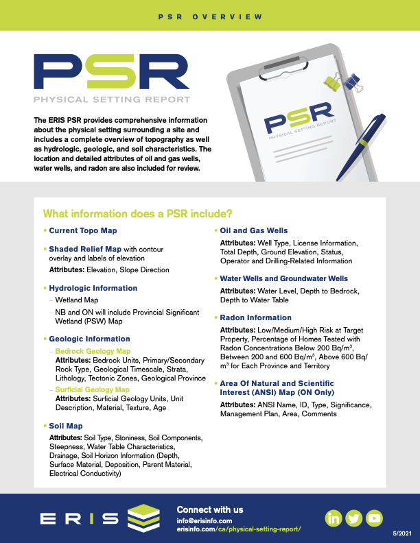 The ERIS Physical Setting Report (PSR) provides comprehensive information about the physical setting surrounding a site and includes a complete overview of topography and surface topology, in addition to hydrologic, geologic and soil characteristics. The location and detailed attributes of oil and gas wells, water wells, public water systems and radon are also included for review.