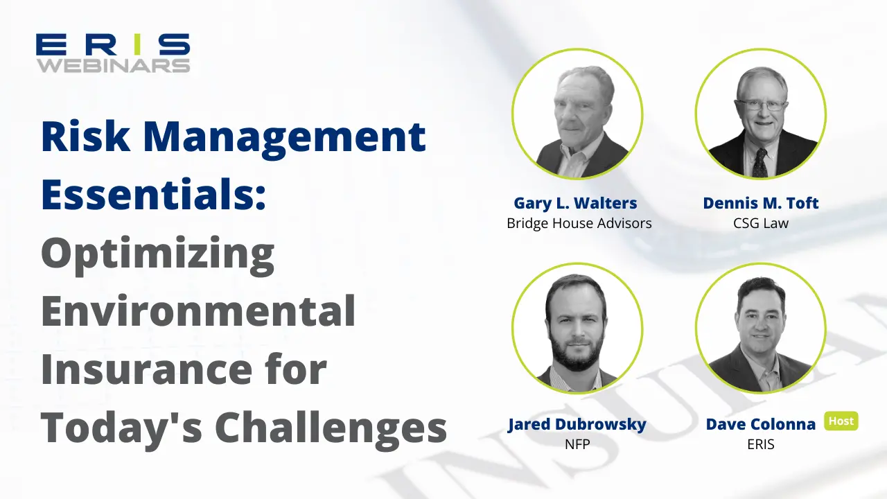 Dave Colonna: Hello, and welcome. While we wait for more participants to join us, on screen you will see the ERIS content disclaimer that you can take a minute to read. As always, the information contained in the webinar, and provided by the hosts or panelists and related material are not intended to constitute advice, including legal advice of any kind, or the rendering of consulting or other professional services, to read more, visit erisinfo.com/disclaimer. This webinar is being recorded and will be posted on the ERIS website in the next few days at erisinfo.com. Today’s presentation will be about an hour and min or so in time. So just a little housekeeping here we will also have time dedicated to Q&A after the presentation. Please enter any questions that you have in the Q&A section of the platform and not in the chat. We’ll just be able to see it easier in that Q&A section. I know a lot of you also submitted questions earlier. We’ll also try and get to all of those after all of the presentations. So with that, let’s get started. I’m Dave Colonna, director of lender solutions here at ERIS and I’ll be moderating today’s Webinar: Risk Management Essentials, Optimizing Environmental Insurance for Today’s Challenges. As you may know, ERIS is an environmental risk and property data solutions company that provides information and tools necessary to assess potential environmental exposures that can impact insurance coverages and liability. We use the most advanced platforms to help environmental professionals, lenders and insurance companies review and analyze critical data and historical products. We also have ERIS direct, which is an online subscription service that allows users to gain immediate access to real time, environmental risk information and empowers decision makers to assess risks quickly. Additionally, the climate risk assessment report offers instant insights to property risks related to climate change, helping stakeholders prepare for both current and future environmental challenges, which is also essential when determining the correct insurance coverage. So on today’s webinar, we’re going to cover a wide range of important topics from legal considerations to environmental assessments and insurance coverage to specific case studies, showcasing how insurance can help mitigate risks during real estate transactions. We’re fortunate today to have a really incredible panel with us. I’d like to welcome them and give a quick introduction. You can also find more information about everybody at erisinfo.com. So 1st with us, we have Gary Walters, an environmental engineer with Bridge House Advisors. Gary has over years of experience in environmental due diligence, hazardous waste management and regulatory compliance. He’s a senior environmental business advisor at Bridge House, following his tenure as a partner at ERM and a branch chief with the U.S. Army Environmental Center. Next, we have Jared Dubrowsky, Senior VP at NFP’s environmental insurance practice. Jared has over years of experience in environmental risk management and insurance specializing in designing programs to address environmental exposures for real estate and business owners. Prior to joining NFP Jared worked in several environmental roles, including Santander. New York City’s department of city planning as well as Stantec. And finally, we have Dennis Toft, chair of Environmental law at CSG PC. Dennis is a well-respected environmental lawyer with expertise in regulatory counseling, environmental due diligence and brownfields redevelopment. He served on multiple New Jersey State environmental advisory councils and has been appointed by several governors for his environmental leadership. So without further ado, I am going to turn it over to Dennis.